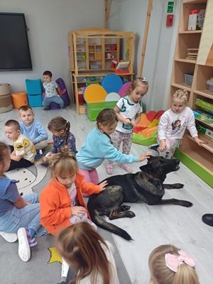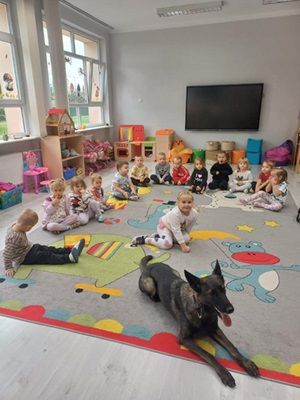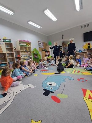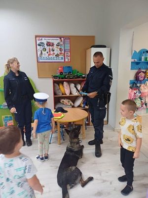 Dnia 25 września przedszkolaków odwiedzili funkcjonariusze z Komendy Powiatowej Policji z Bolesławca. Każde dziecko chciało obejrzeć z bliska kajdanki, lizak, a także przymierzyć policyjną czapkę. Było to bardzo udane spotkanie. Na zakończenie wszyscy uczestnicy spotkania wykonali z policjantami pamiątkowe zdjęcie.