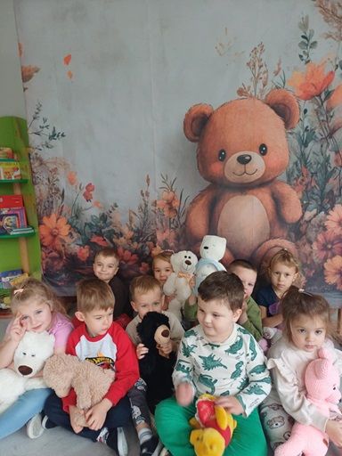 Dzien Pluszowego Misia w najmłodszej grupie. Dzień Misia to coroczne święto obchodzone 25 listopada, podczas którego dzieci przynoszą do przedszkola swoje ulubione pluszowe misie. Tego dnia organizowane są specjalne atrakcje, takie jak zabawy ruchowe, odgadywanie zagadek o misiach, wspólne śpiewanie piosenek i tworzenie prac plastycznych.Autor: Justyna Siemaszko